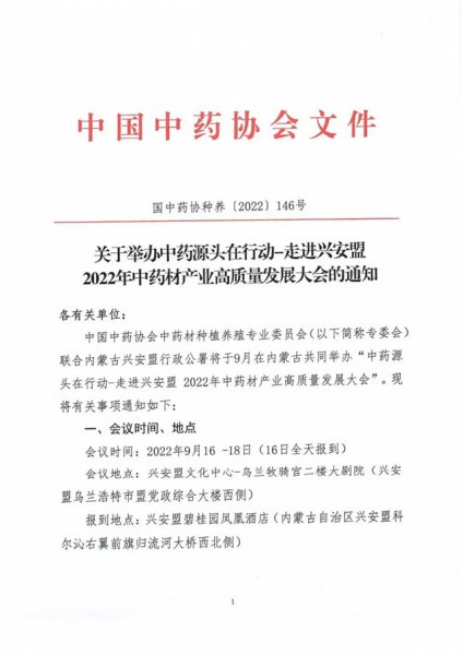 中国中药协会中药材种植养殖专业委员会(以下简称专委会)联合内蒙古兴安盟行政公署将于9月在内蒙古乌兰浩特市共同举办“中药源头在行动-走进兴安盟•2022年中药材产业高质量发展大会”。现将有关事项通知如下: