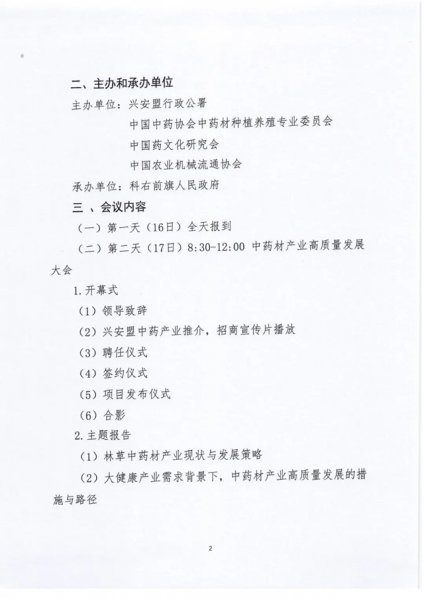 (一)第一天(16日),全天报到(二)第二天(17日)上午,中药材产业高质量发展大会1.开幕式(8:30-10:30)(1)领导致辞(2)兴安盟市政府中药产业推介,招商宣传片播放(3)聘任仪式(4)战略合作签约仪式(5)重大项目发布仪式