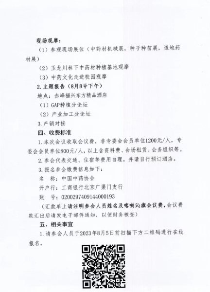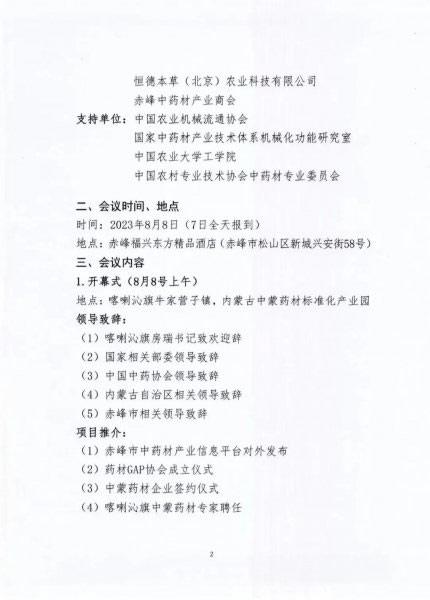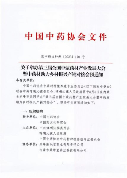 中国中药协会中药材种植养殖专业委员会(以下简称专委会)联合中共喀喇沁旗委员会、喀喇沁旗人民政府、中国农业机械流通协会中药材专业专委会将于8月7日-9日在内蒙古赤峰市共同举办“第三届全国中蒙药材产业发展大会暨中蒙药材助力乡村振兴产销对接会”。现将有关事项通知如下: