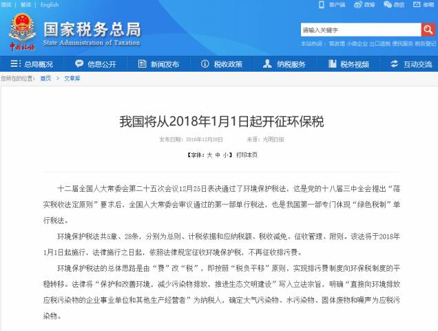 2018年1月1日起开征环保税