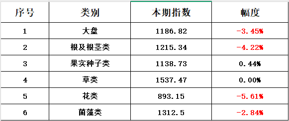 (1)根及根茎类:上月指数收于1268.89点,本月指数1215.34点,下跌53.55点,跌幅4.22%。