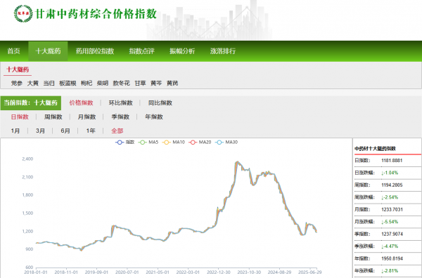 甘肃十大陇药(当归、黄芪、党参、大黄、板蓝根、枸杞、柴胡、款冬花、甘草、黄芩)价格监测显示,2025年8月份甘肃十大陇药价格指数为1233.70点(以2018年1月份平均价格为基期),与上期1306.12点(2025年7月)相比,下滑72.42点,跌幅5.54%。