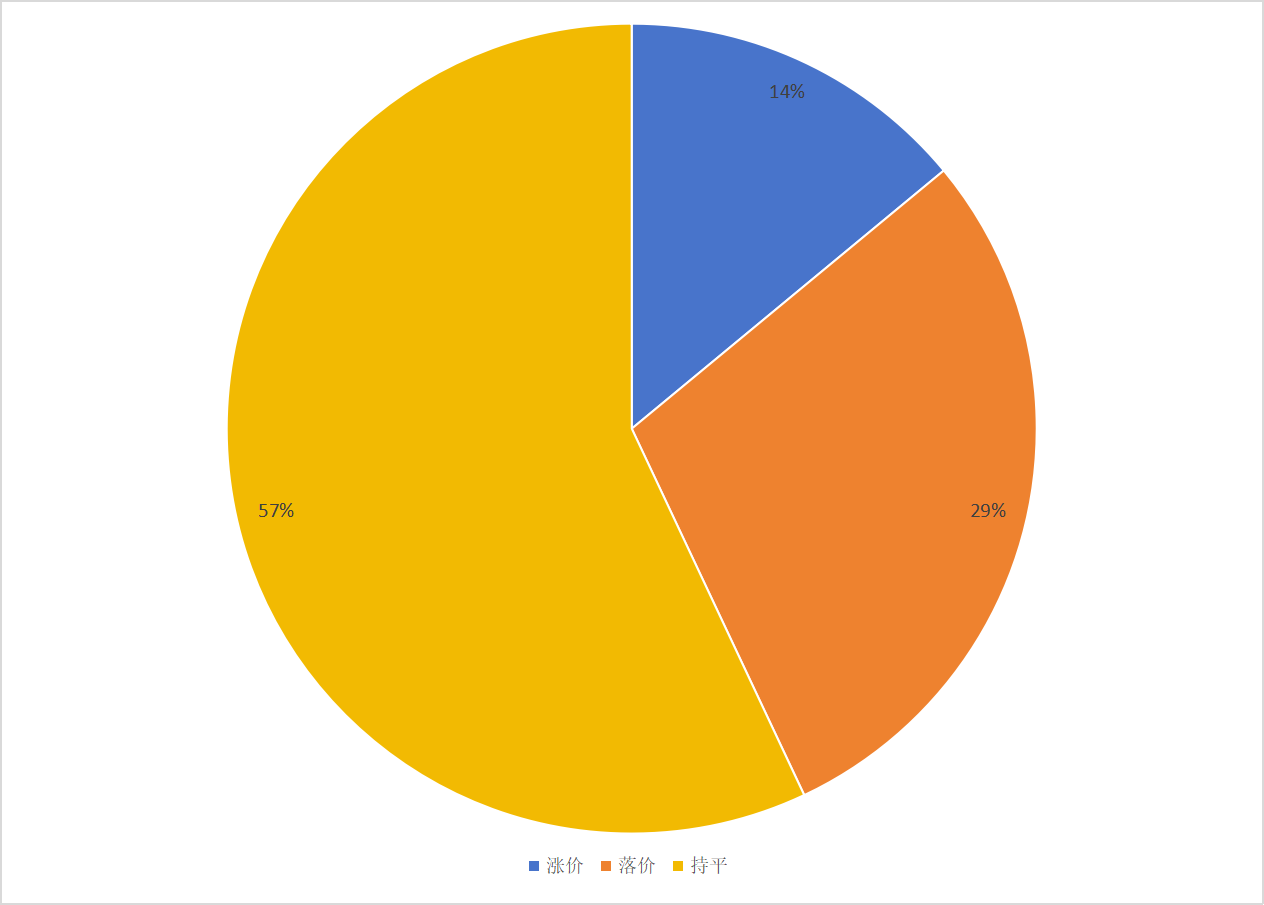 果实种子类7个品规中(孜然、小茴香、山桃仁、枸杞、牛蒡子、苦杏仁、莱菔子),上涨的品规占14%;落价品规占29%;价格持平的品规占57%。