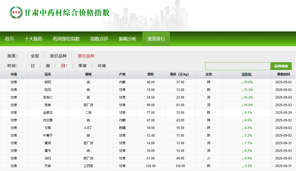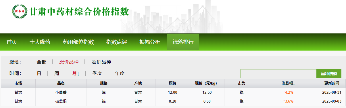2025年8月份甘肃中药材价格指数月度运行分析