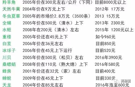 从以上数据我们可以看到,有些中药材在10年左右的时间,价格翻了数十倍,涨幅相当惊人。