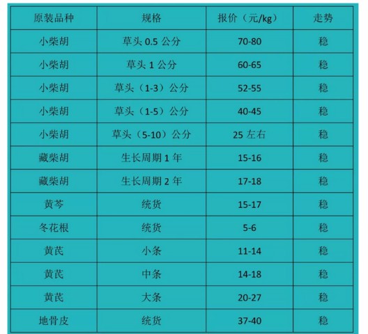 今日原装药材交易区上货量约160吨,藏柴胡、黄芩上货量大,柴胡近期走势较好,价格小幅度上涨,收购商较多。柴胡(草头1cm)成交价60元/kg,无头货85元/kg左右。黄芩成交价15-16元/kg;藏柴胡价格16-18元/kg左右;地骨皮成交价37元/kg;其他原装药材价格稳定,走动较快。
