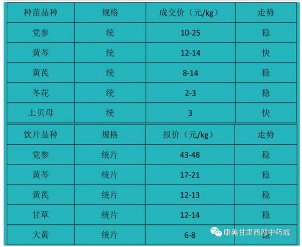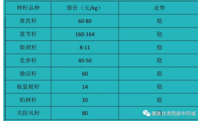 种苗交易区有黄芩苗、党参苗、黄芪苗、土贝母等,黄芩苗成交价12元/kg;黄芪苗5-8元/kg;党参中大苗32元/kg,走势较稳。其他种苗上货量少,走势快。中药材种籽整体走动快,主要以党参籽、黄芩籽、黄芪籽、独活籽、关防风籽为主,价格稳定。黄芩籽150-170元/kg;党参籽价格30-40元/kg;黄芪籽70-90元/kg;独活籽价格30-40元/kg;关防风籽50元/kg左右。