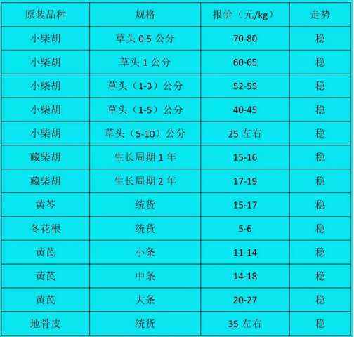 市场动态:市场今日原装药材交易区药材上货量大,约200吨,药材整体走势好,价格稳定,主要以黄芩、柴胡、藏柴胡、党参交易为主。柴胡价格坚挺,草头(0.5-1cm)要价65元/kg,草头(1-5cm左右)价格45元/kg,走动快;黄芩成交价15-16.5元/kg,走势较稳;藏柴胡成交价15-17元/kg;黄芪中小条价格12元/kg左右;党参中小条成交价34-40元/kg;板蓝根价格6元/kg左右;茵陈成交价5元/kg,其他原装药材价格稳定,走动较快。