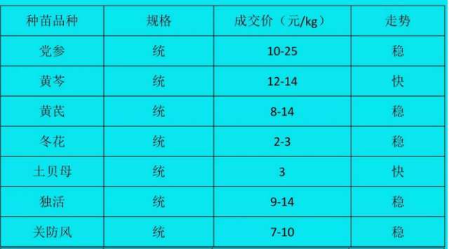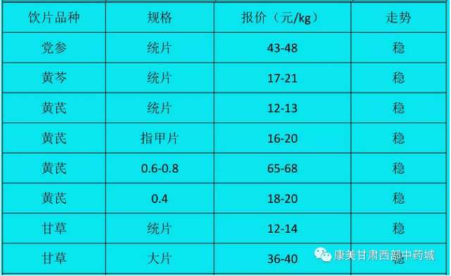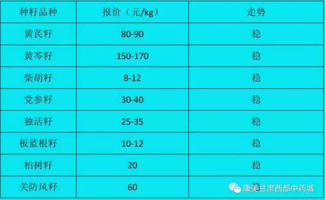 中药材种籽交易区采购药商多,种类主要有党参籽、黄芩籽、黄芪籽、独活籽、柴胡籽、藏柴胡籽、小柴胡籽、关防风籽、板蓝根籽等,价格稳定。党参籽价格30-40元/kg;黄芩籽成交价150-170元/kg,走动快;黄芪籽价格80-90元/kg,价格较稳;板蓝根籽价格8-10元/kg左右。中药饮片区主要以小批量走货为主,交易稳定。