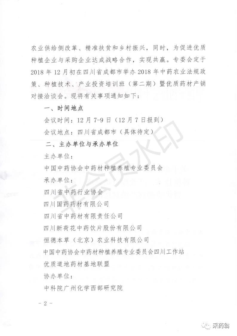 按照中国中药协会中药材种植养殖专业委员会(以下简称“专委会”)2018年度工作安排,为进一步加大中药农业相关领域培训力度,提升会员企业在借力国家产业政策发展自身业务的运用能力和水平,进而服务于中药产业转型升级、农业供给侧改革、精准扶贫和乡村振兴,同时,为促进优质种植企业与采购企业达成战略合作,实现共赢。专委会定于2018年12月初在四川省成都市举办2018年中药农业法规政策、种植技术、产业投资培训班(第二期)暨优质药材产销对接洽谈会。现将有关事项通知如下:
