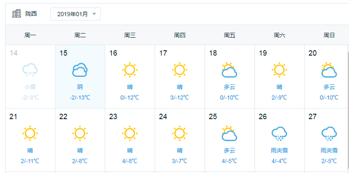 2019年1月15日-1月24日陇西天气情况: