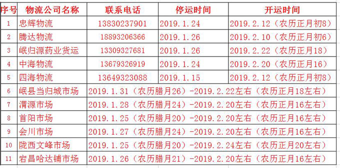 2019年春节当归城物流运输公司及各药材市场停运停市时间表