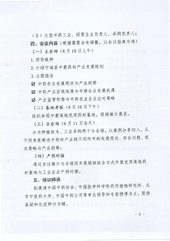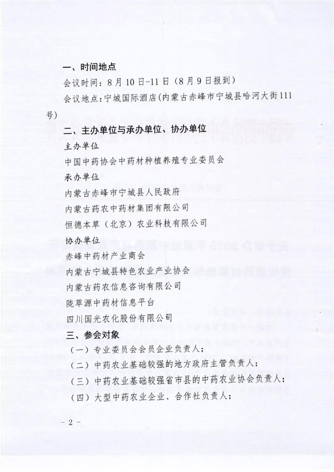 为进一步宣贯国家相关产业政策规划,推动中药农业科技服务产业生产,按照中国中药协会中药材种植养殖专业委员会(以下简称“专委会”)2019年度工作安排,定于2019年8月11-12日在内蒙古宁城县举办2019年道地中蒙药材产业发展论坛暨优质药材基地与工业企业对接洽谈会。现将有关事项通知如下: