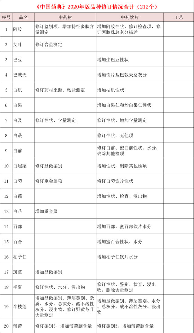 终结版| 2020版《中国药典》中药材及饮片修订项目汇总,共计212个!收藏版!