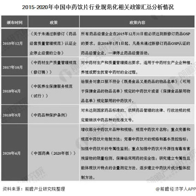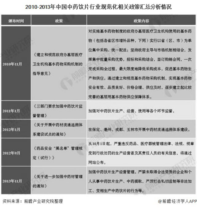 因此,我国针对这些问题也出台了相关政策推进行业往规范化、标准化方向发展,如出台《全国医疗机构中药饮片管理专项检查方案》,不断完善医疗机构中药饮片管理的有效措施和长效机制。