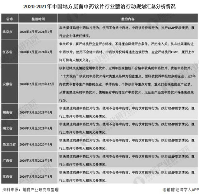 针对中药饮片生产制造不合规的问题,我国开展了中药饮片专项整治活动。2020年2月,国家药监局再度印发《中药饮片专项整治工作方案》,要求各省市药品监管部门进行当地的中药饮片专项整治工作,坚决查处行业违法违规行为。目前,北京、江苏、湖南、湖北等多地也已经出台中药饮片专项整治工作方案。